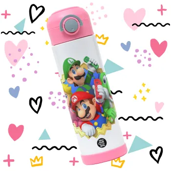 Super mario and Friends, Παιδικό παγούρι θερμό, ανοξείδωτο, με καλαμάκι ασφαλείας, ΡΟΖ (500ml)