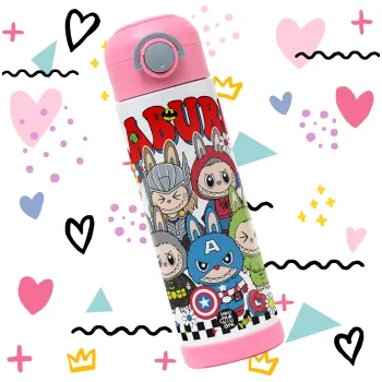 Labubu superheroes, Παιδικό παγούρι θερμό, ανοξείδωτο, με καλαμάκι ασφαλείας, ΡΟΖ (500ml)