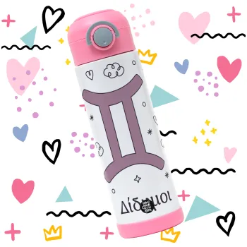 Ζώδια Δίδυμοι, Παιδικό παγούρι θερμό, ανοξείδωτο, με καλαμάκι ασφαλείας, ΡΟΖ (500ml)
