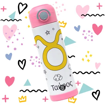 Ζώδια Ταύρος, Παιδικό παγούρι θερμό, ανοξείδωτο, με καλαμάκι ασφαλείας, ΡΟΖ (500ml)
