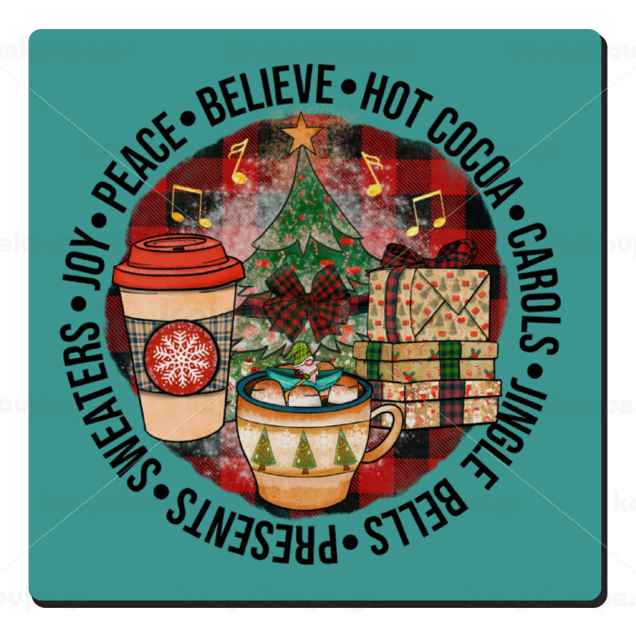 Joy, Peace, Believe, Hot Cocoa, Carols, Τετράγωνο μαγνητάκι ξύλινο 6x6cm