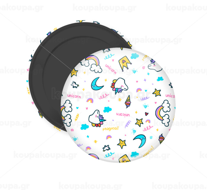 Unicorn pattern white, Μαγνητάκι ψυγείου στρογγυλό διάστασης 5cm