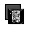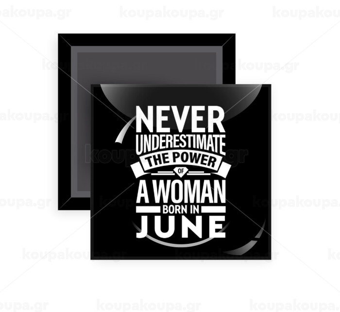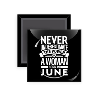Never Underestimate the poer of a Woman born in..., Μαγνητάκι ψυγείου τετράγωνο διάστασης 5x5cm