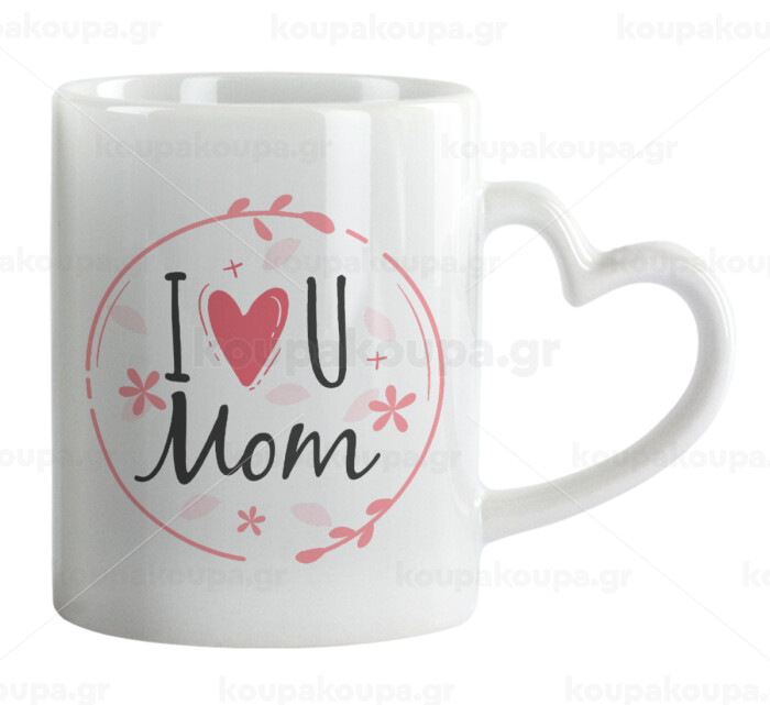 I Love you Mom pink, Κούπα καρδιά χερούλι λευκή, κεραμική, 330ml