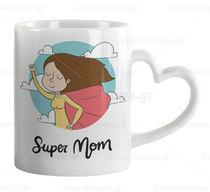 Super mom, Κούπα καρδιά χερούλι λευκή, κεραμική, 330ml