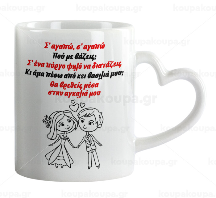 Σ΄ αγαπώ σ΄ αγαπώ που με βάζεις, Κούπα καρδιά χερούλι λευκή, κεραμική, 330ml