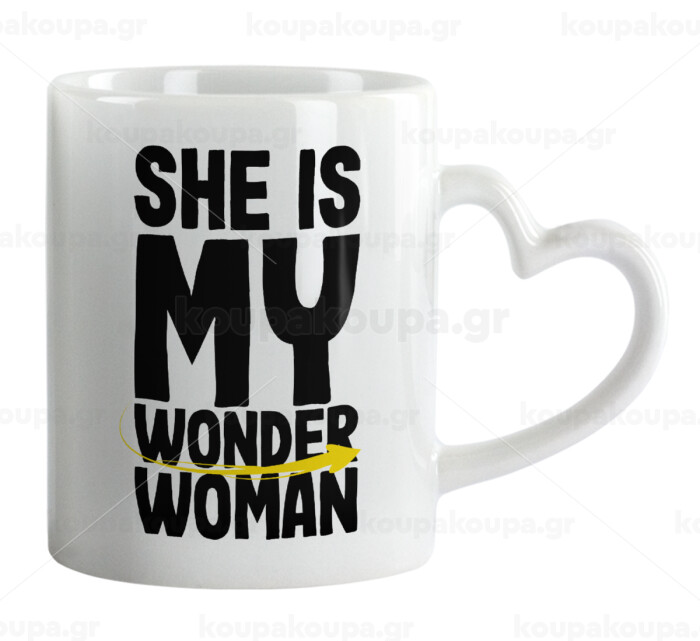 She is my wonder woman, Κούπα καρδιά χερούλι λευκή, κεραμική, 330ml
