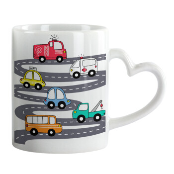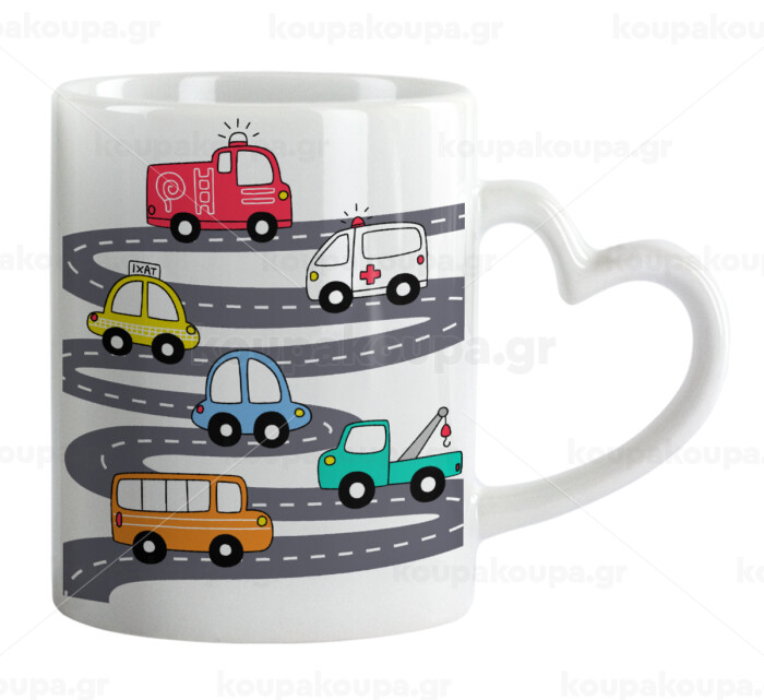 Hand drawn childish set with cars, Κούπα καρδιά χερούλι λευκή, κεραμική, 330ml