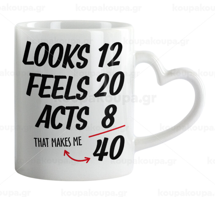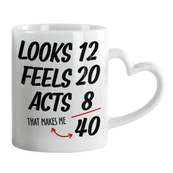 Looks, feels, acts LIKE your AGE, Κούπα καρδιά χερούλι λευκή, κεραμική, 330ml