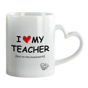 i love my teacher but no the homework, Κούπα καρδιά χερούλι λευκή, κεραμική, 330ml