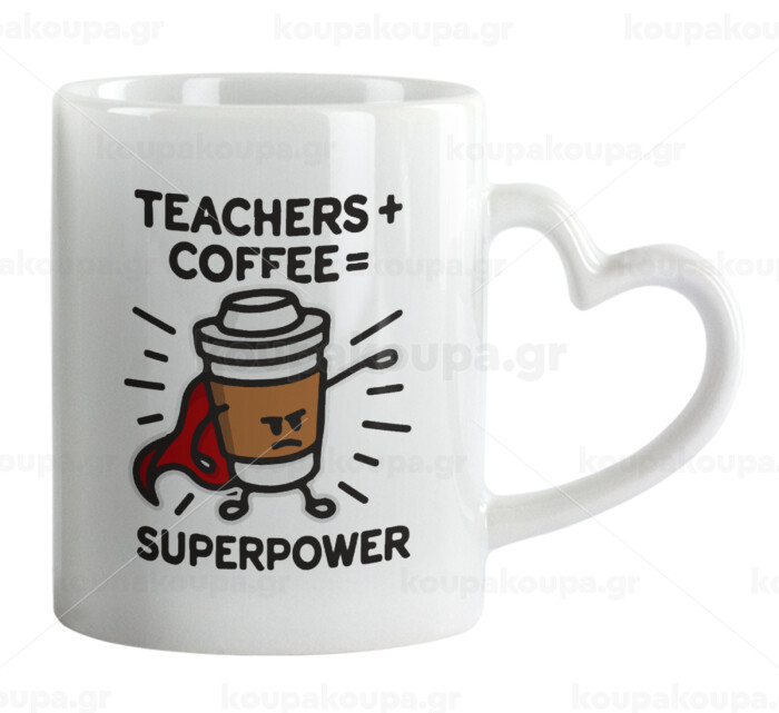 Teacher Coffee Super Power, Κούπα καρδιά χερούλι λευκή, κεραμική, 330ml