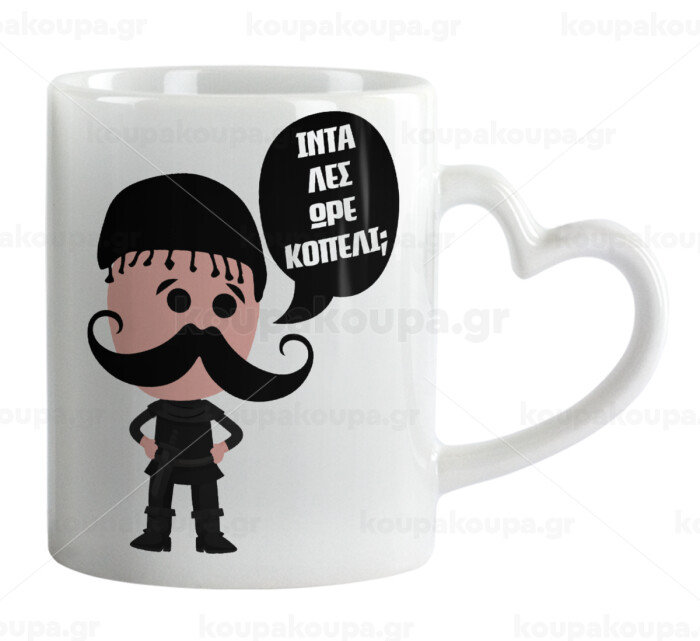 Κρητικός "Ίντα λες ωρέ κοπέλι", Κούπα καρδιά χερούλι λευκή, κεραμική, 330ml