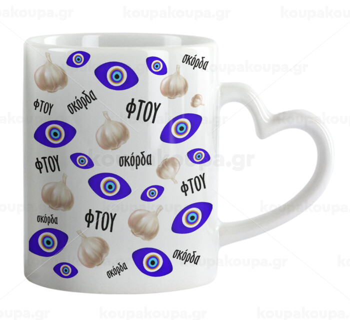 Φτου, φτου, σκόρδα!!!, Κούπα καρδιά χερούλι λευκή, κεραμική, 330ml
