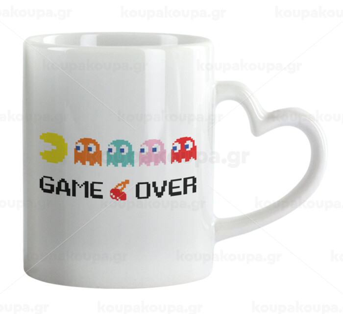 GAME OVER pac-man, Κούπα καρδιά χερούλι λευκή, κεραμική, 330ml