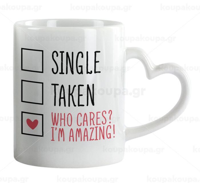 Single, Taken, Who cares i'm amazing, Κούπα καρδιά χερούλι λευκή, κεραμική, 330ml