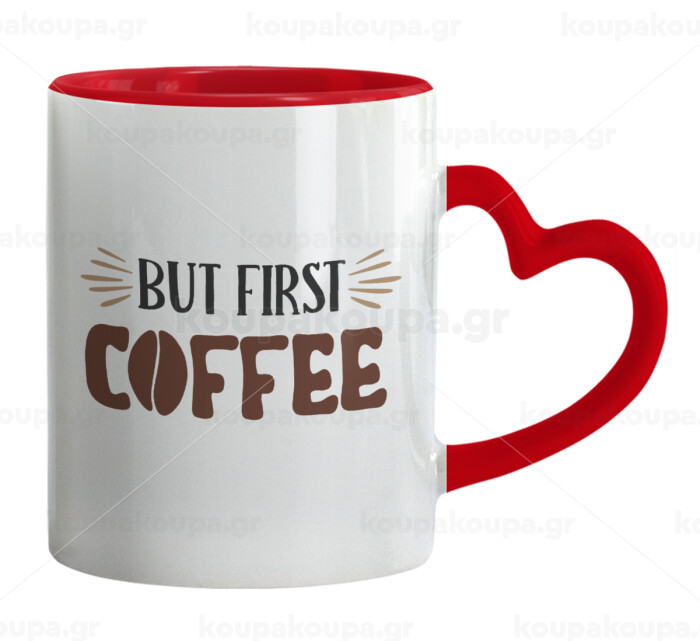 But first Coffee, Κούπα καρδιά χερούλι κόκκινη, κεραμική, 330ml