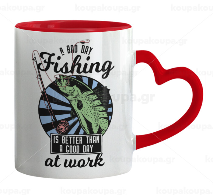 A bad day FISHING is better than a good day at work, Κούπα καρδιά χερούλι κόκκινη, κεραμική, 330ml
