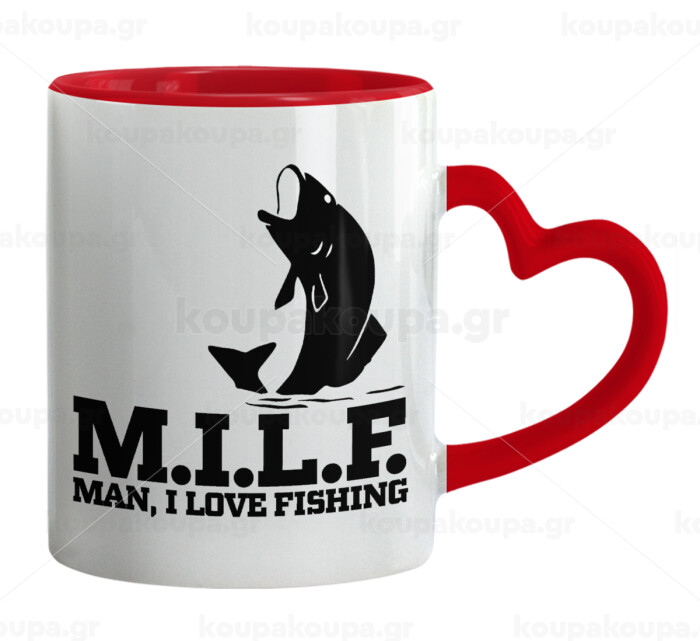M.I.L.F. Mam i love fishing, Κούπα καρδιά χερούλι κόκκινη, κεραμική, 330ml