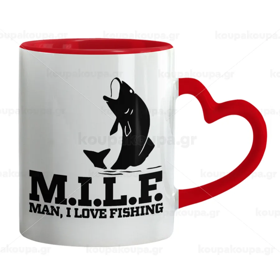 M.I.L.F. Mam i love fishing, Κούπα καρδιά χερούλι κόκκινη, κεραμική, 330ml