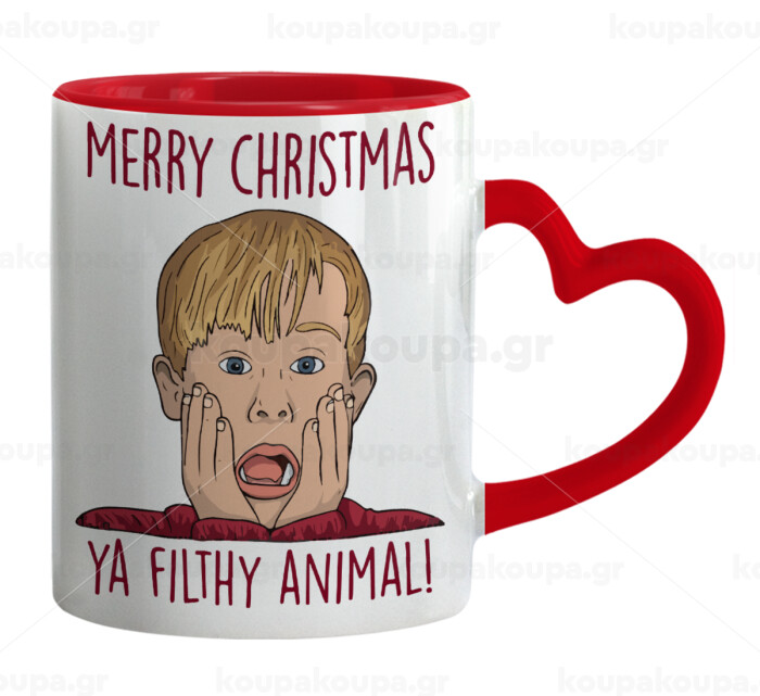 home alone, Merry Christmas ya filthy animal, Κούπα καρδιά χερούλι κόκκινη, κεραμική, 330ml