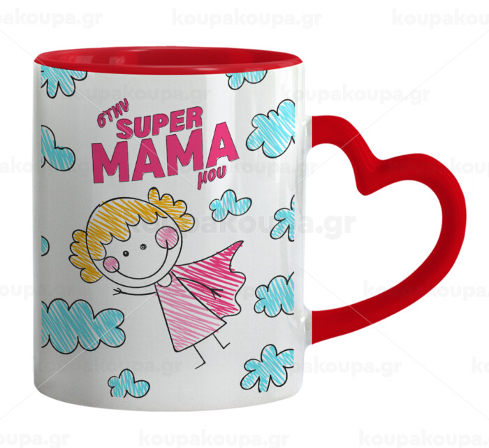 Στην SUPER μαμά μου, comic, Κούπα καρδιά χερούλι κόκκινη, κεραμική, 330ml