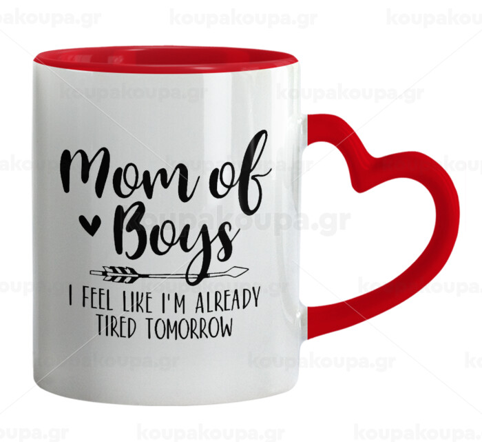 Mom of boys i feel like im already tired tomorrow, Κούπα καρδιά χερούλι κόκκινη, κεραμική, 330ml