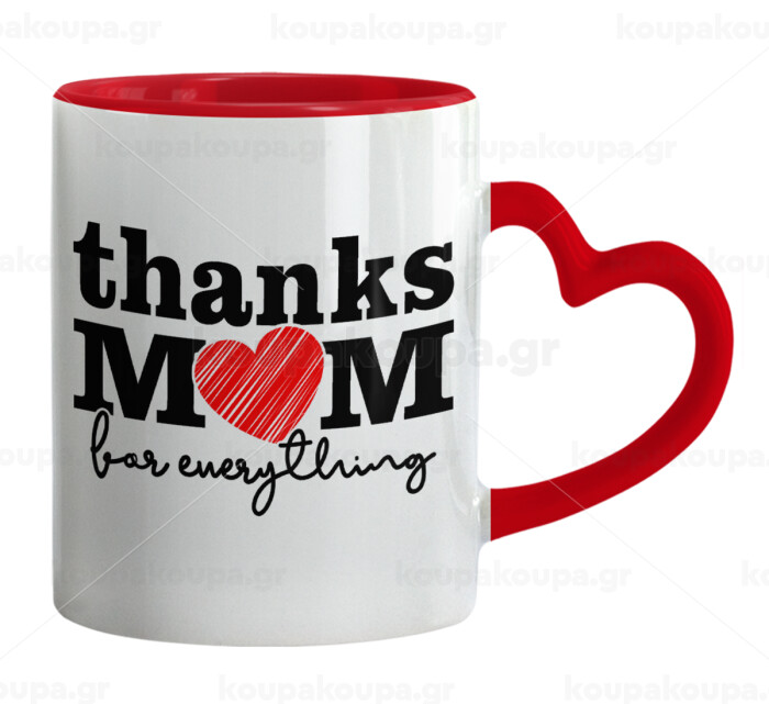 Thanks mom for everything, Κούπα καρδιά χερούλι κόκκινη, κεραμική, 330ml