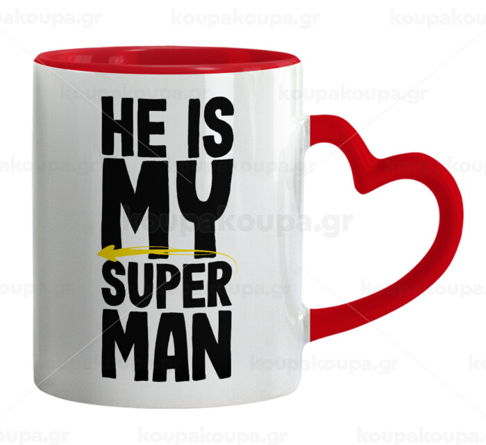 He is my superman, Κούπα καρδιά χερούλι κόκκινη, κεραμική, 330ml