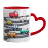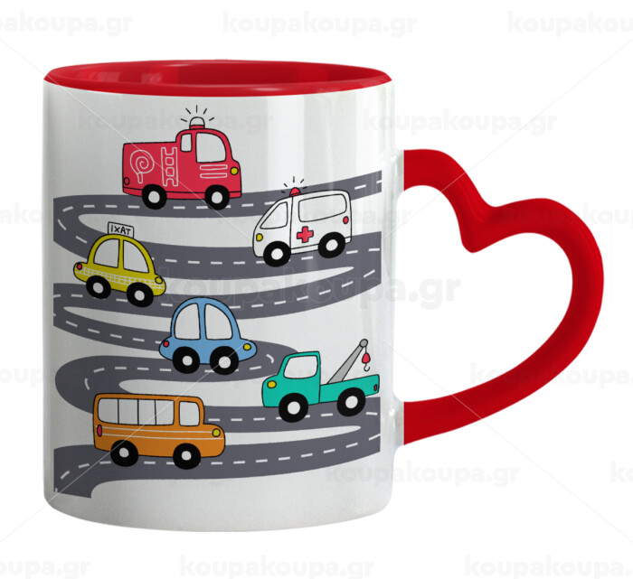 Hand drawn childish set with cars, Κούπα καρδιά χερούλι κόκκινη, κεραμική, 330ml