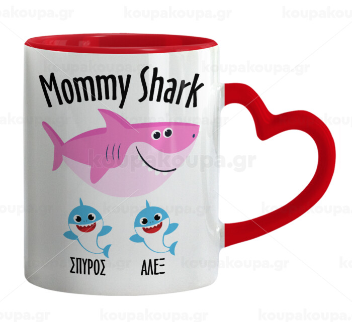 Mommy Shark (με ονόματα παιδικά), Κούπα καρδιά χερούλι κόκκινη, κεραμική, 330ml