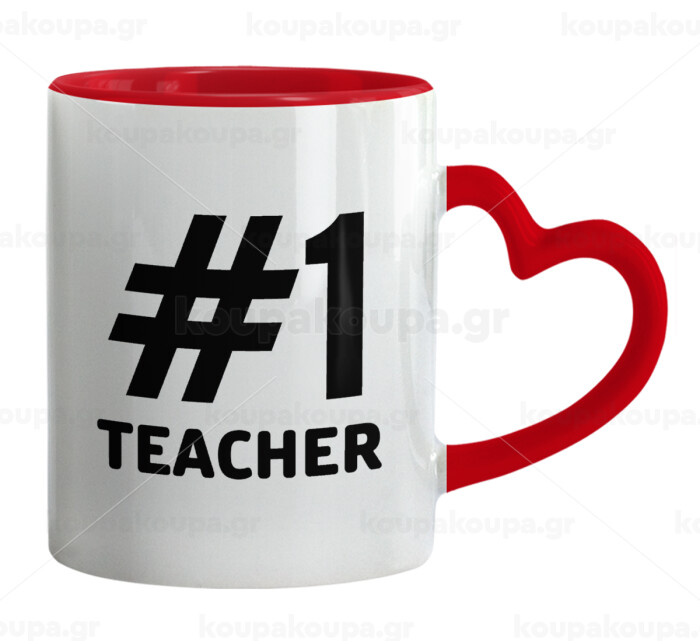 #1 teacher, Κούπα καρδιά χερούλι κόκκινη, κεραμική, 330ml