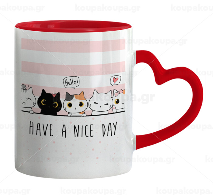 Have a nice day cats, Κούπα καρδιά χερούλι κόκκινη, κεραμική, 330ml