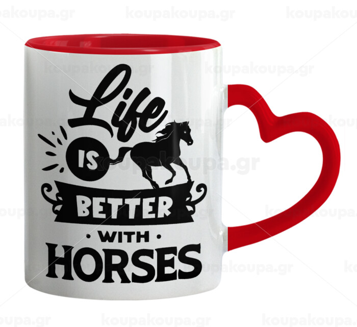 Life is Better with a Horses, Κούπα καρδιά χερούλι κόκκινη, κεραμική, 330ml