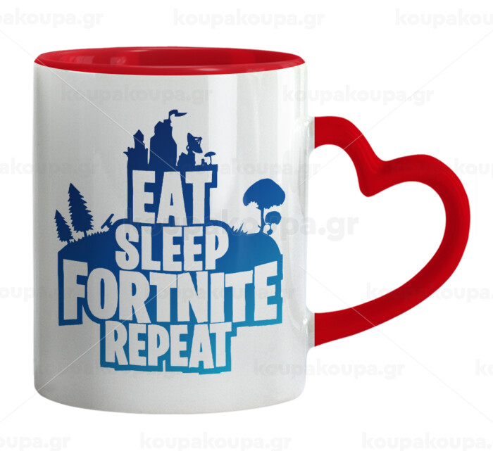 Eat Sleep Fortnite Repeat, Κούπα καρδιά χερούλι κόκκινη, κεραμική, 330ml