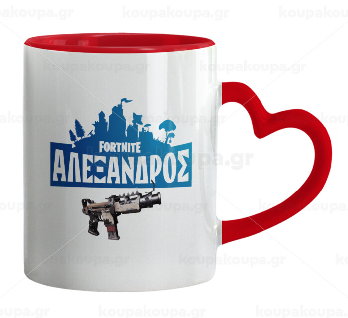 Fortnite with gun με το όνομα σου, Κούπα καρδιά χερούλι κόκκινη, κεραμική, 330ml