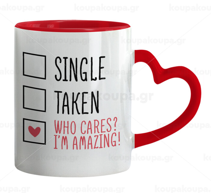 Single, Taken, Who cares i'm amazing, Κούπα καρδιά χερούλι κόκκινη, κεραμική, 330ml