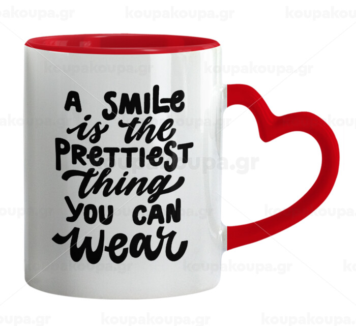 A smile is the prettiest thing you can wear, Κούπα καρδιά χερούλι κόκκινη, κεραμική, 330ml