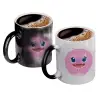 Κούπα μαύρη μαγική γυαλιστερή εξαιρετικής ποιότητας με έντονα χρώματα. Με καφέ, τσάι, νερό ή οποιοδήποτε υγρό από 50 βαθμούς και άνω η κούπα αρχίζει να εμφανίζει το σχέδιο έκπληξη. Μόλις το υγρό πέφτει κάτω από τους 50 βαθμούς και αρχίζει να κρυώνει, ξαναγίνεται μαύρη.