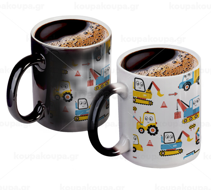 Κούπα μαύρη μαγική γυαλιστερή εξαιρετικής ποιότητας με έντονα χρώματα. Με καφέ, τσάι, νερό ή οποιοδήποτε υγρό από 50 βαθμούς και άνω η κούπα αρχίζει να εμφανίζει το σχέδιο έκπληξη. Μόλις το υγρό πέφτει κάτω από τους 50 βαθμούς και αρχίζει να κρυώνει, ξαναγίνεται μαύρη.