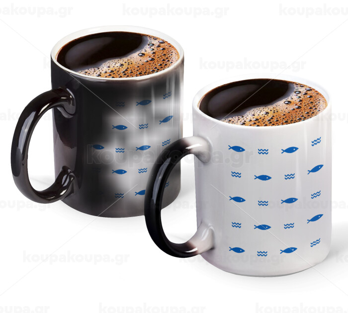 Κούπα μαύρη μαγική γυαλιστερή εξαιρετικής ποιότητας με έντονα χρώματα. Με καφέ, τσάι, νερό ή οποιοδήποτε υγρό από 50 βαθμούς και άνω η κούπα αρχίζει να εμφανίζει το σχέδιο έκπληξη. Μόλις το υγρό πέφτει κάτω από τους 50 βαθμούς και αρχίζει να κρυώνει, ξαναγίνεται μαύρη.