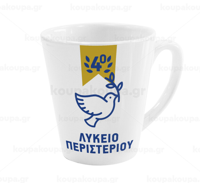 Έμβλημα Σχολικό μπλε/χρυσό περιστέρι, Κούπα κωνική Latte Λευκή, κεραμική, 300ml