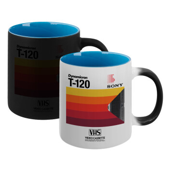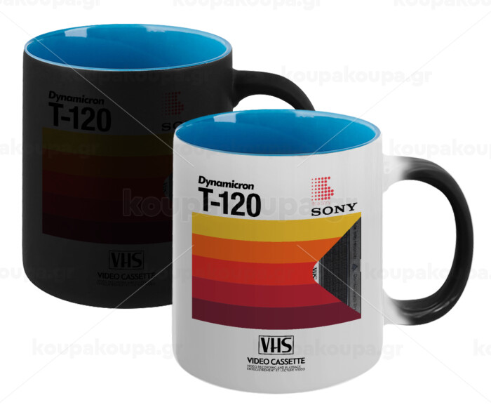 VHS sony dynamicron T-120, Κούπα Μαγική εσωτερικό μπλε, κεραμική 330ml που αλλάζει χρώμα με το ζεστό ρόφημα