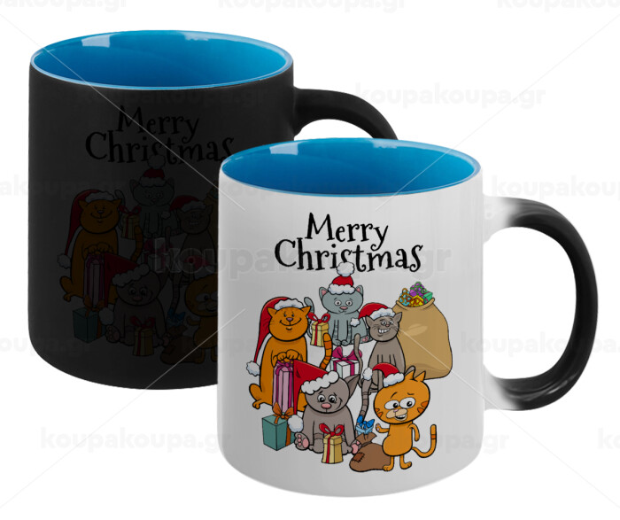 Merry Christmas Cats, Κούπα Μαγική εσωτερικό μπλε, κεραμική 330ml που αλλάζει χρώμα με το ζεστό ρόφημα
