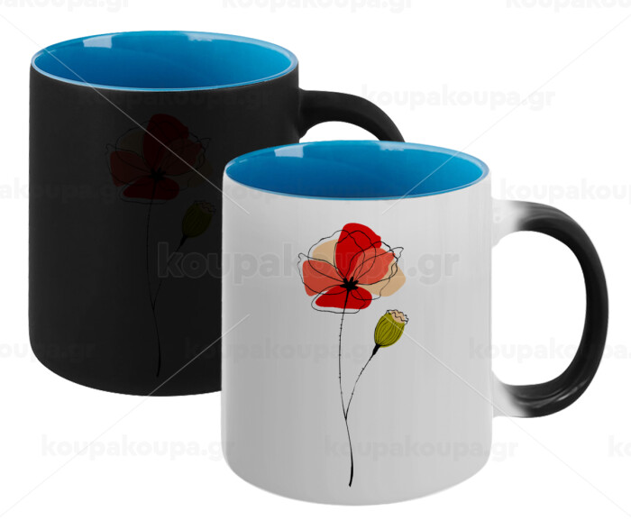 Red poppy flowers papaver, Κούπα Μαγική εσωτερικό μπλε, κεραμική 330ml που αλλάζει χρώμα με το ζεστό ρόφημα