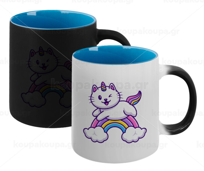 Cute cat unicorn, Κούπα Μαγική εσωτερικό μπλε, κεραμική 330ml που αλλάζει χρώμα με το ζεστό ρόφημα