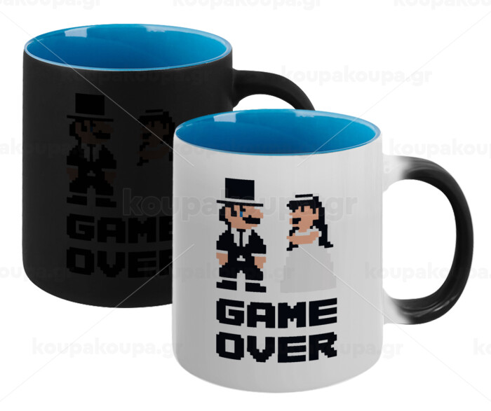 8bit Game Over Couple Wedding, Κούπα Μαγική εσωτερικό μπλε, κεραμική 330ml που αλλάζει χρώμα με το ζεστό ρόφημα