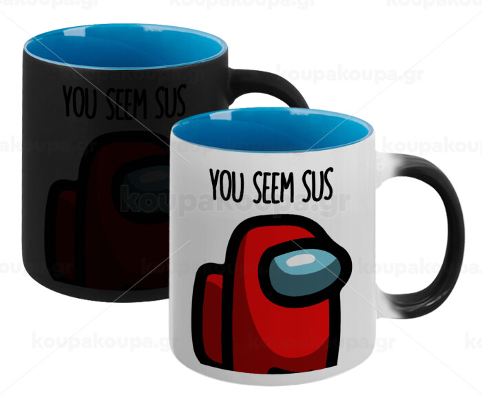 Among US, you seem sus, Κούπα Μαγική εσωτερικό μπλε, κεραμική 330ml που αλλάζει χρώμα με το ζεστό ρόφημα
