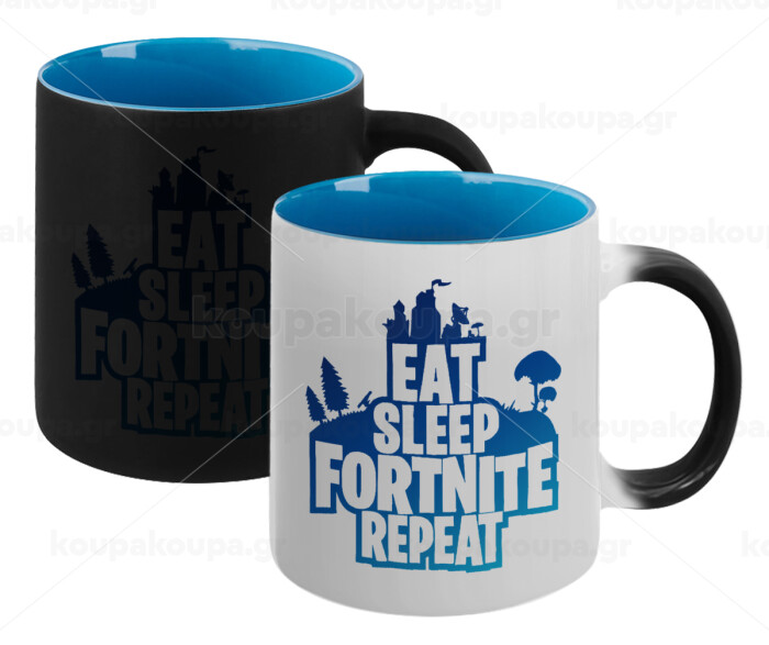 Eat Sleep Fortnite Repeat, Κούπα Μαγική εσωτερικό μπλε, κεραμική 330ml που αλλάζει χρώμα με το ζεστό ρόφημα