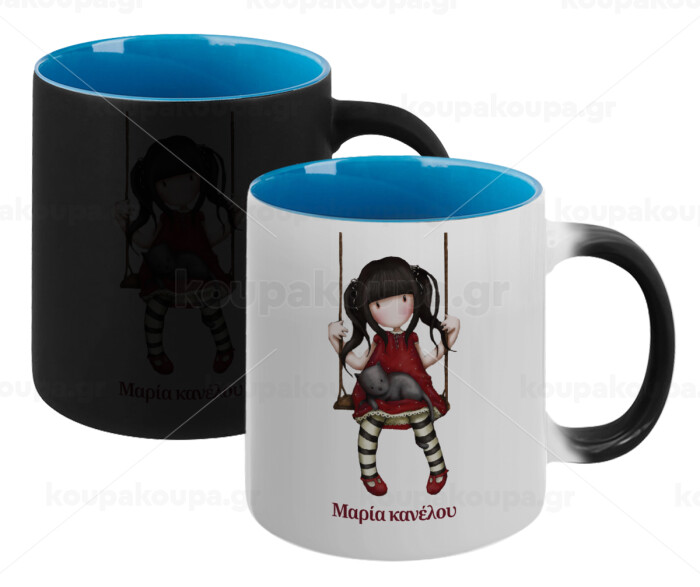 Κούπα μαύρη μαγική ΜΑΤ εξαιρετικής ποιότητας. Με καφέ, τσάι, νερό ή οποιοδήποτε υγρό από 50 βαθμούς και άνω η κούπα αρχίζει να εμφανίζει το σχέδιο έκπληξη. Μόλις το υγρό πέφτει κάτω από τους 50 βαθμούς και αρχίζει να κρυώνει, ξαναγίνεται μαύρη.