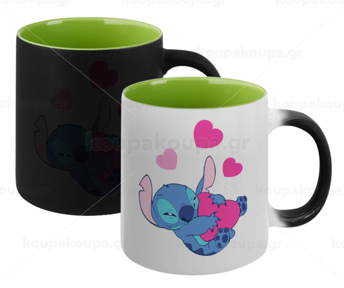 Lilo & Stitch hugs and hearts, Κούπα Μαγική εσωτερικό πράσινο, κεραμική 330ml που αλλάζει χρώμα με το ζεστό ρόφημα